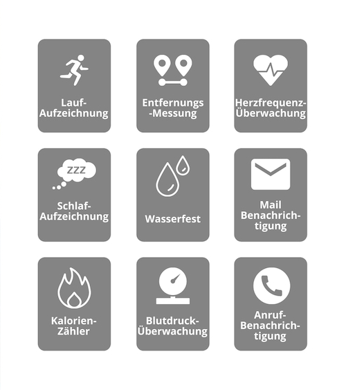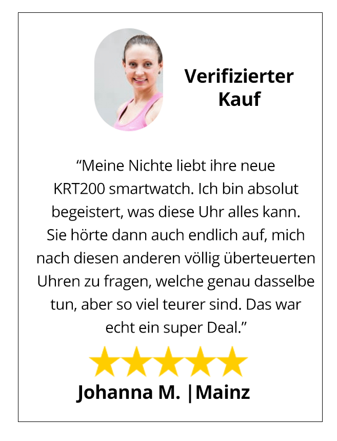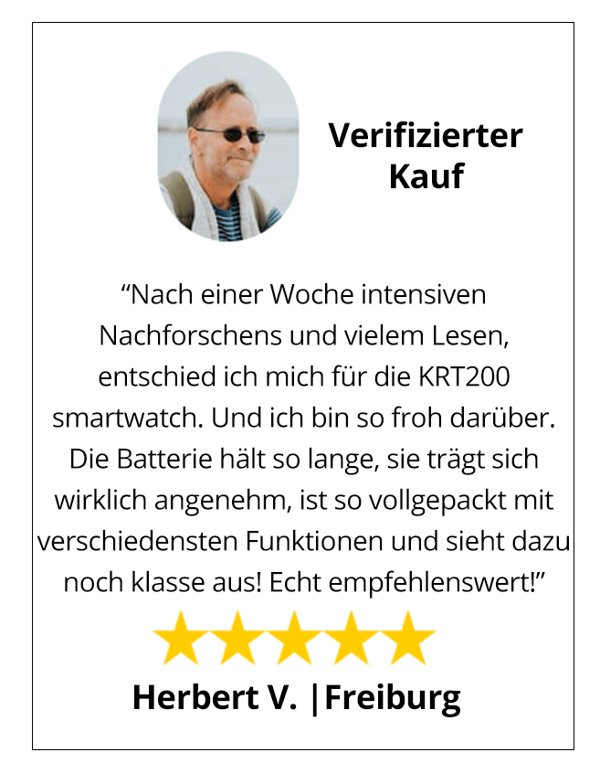 Die KRT200 Smartwatch ist durch den integrierten Schlaf- und Kalorienmanagermanager, den Bewegungstracker und durch die Kommunikationsfunktion nicht nur die optimale allround Begleitung im alltäglichen Leben – auch eignet sie sich durch die umfassende Fitnesstracking Funktion hervorragend für eine effektive Leistungssteigerung im sportlichen Bereich. Zudem kann diese Revolution unter den Uhren durch eine zuverlässige Wasserbeständigkeit selbst beim Schwimmtraining getrost genutzt werden. Für die Verbesserung der allgemeinen Fitness – sei es hinsichtlich der körperlichen Aktivität oder der Gewichtskontrolle – stellt sie also den perfekten Begleiter dar.